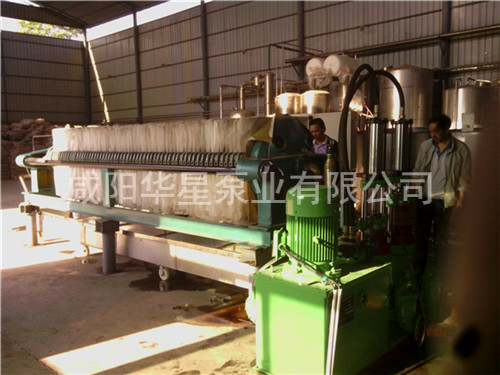 壓濾機進料的專用泵。壓濾機操作前須進行整機檢查:查看濾布有無打折或重疊現象,電源是否已正常連接。檢 查后即可進行壓緊操作,先按一下“啟動“按鈕,油泵開始工作,然后再按一下“壓緊”按 鈕,活塞推動壓緊板壓緊,當壓緊力到達調定高點壓力后,液壓系統自動跳停。